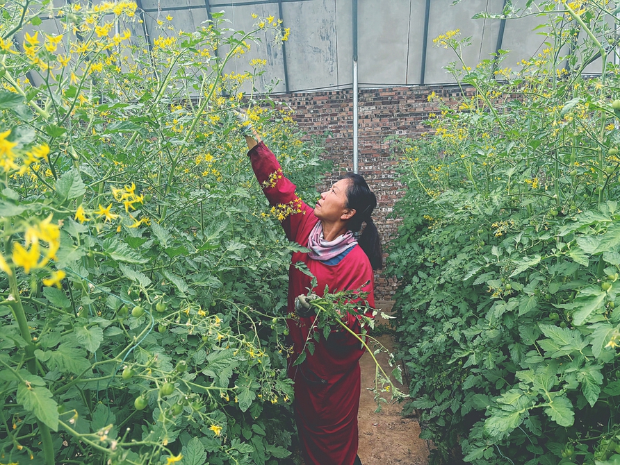 山河村大棚采摘园的工作人员正在给小番茄打杈。本报实习记者姚雅馨摄