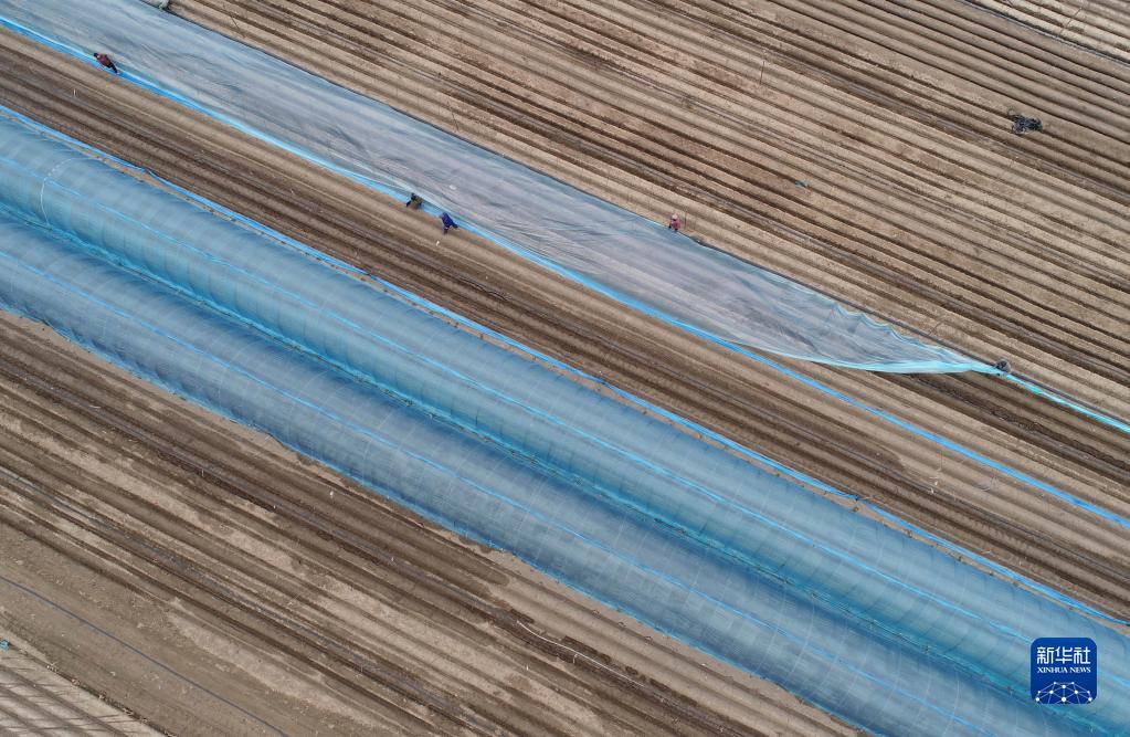 在河北省赵县韩村镇,农民在搭建姜棚(3月30日摄,无人机照片)。(新华社记者 杨世尧 摄)