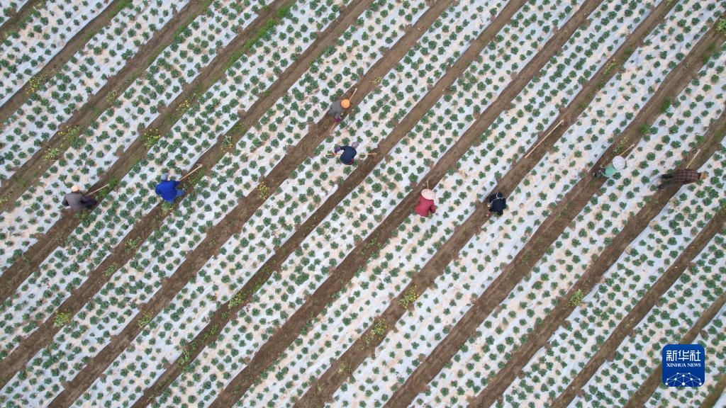 在湖南省永州市道县梅花镇贵头村,村民在菜地里劳作(4月4日摄)。(新华社发 何红福 摄)