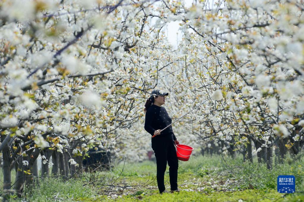 在河南省驻马店市汝南县宿鸭湖街道五里岗村,当地果农为梨树人工授粉(4月1日摄)。(新华社发 孙凯 摄)
