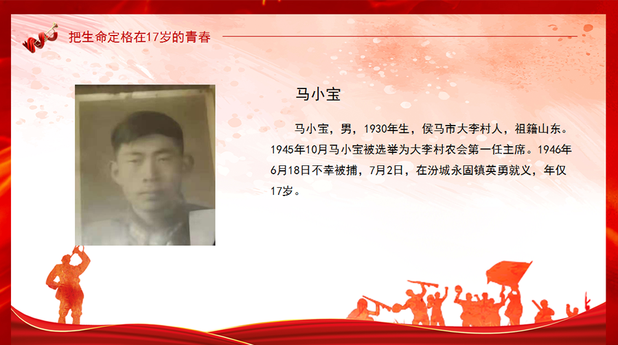 马小宝,男,1930年生,侯马市大李村人,祖籍山东。1945年10月马小宝被选举为大李村农会第一任主席。1946年6月18日不幸被捕,7月2日,在汾城永固镇英勇就义,年仅17岁。