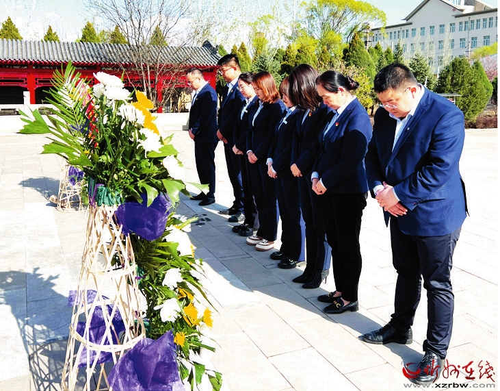 在庄严肃穆的烈士纪念碑前,全体党员向烈士敬献花圈,并列队肃立,鞠躬默哀,表达对革命英烈的崇高敬意和无限哀思。在党支部书记的带领下,全体党员重温入党誓词。大家纷纷表示,参加此次主题党日活动很受教育,进一步坚定了理想信念,将把红色革命教育激发出来的热情转化为干事创业的强大动力,助推全行高质量发展。(辛丽芳摄)