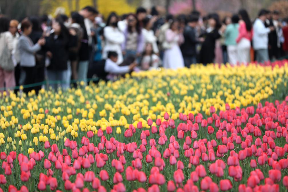 2024年4月5日,游客在河北沧州名人植物园内赏花游玩。新华社发(周洋摄)