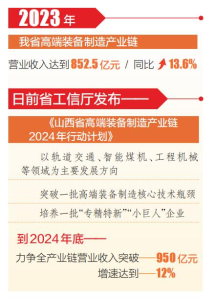省工信厅日前发布《山西省高端装备制造产业链2024年行动计划》,确立年度推进目标:以轨道交通、智能煤机、工程机械等领域为主要发展方向,突破一批高端装备制造核心技术瓶颈,培养一批“专精特新”“小巨人”企业,提升全产业链科技创新能力,强化高端装备制造供应链稳定性和配套能力。并提出,到2024年底,力争全产业链营业收入突破950亿元,增速达到12%。