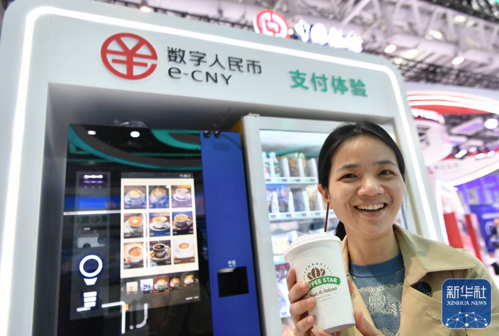 ↑4月26日,在第六届数字中国建设成果展览会现场,一名观众展示用数字人民币购买的咖啡。