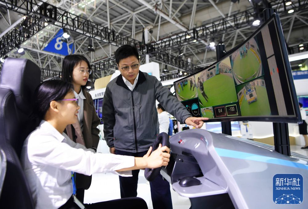 ↑4月26日,在第六届数字中国建设成果展览会上,观众体验金龙5G远程驾驶。