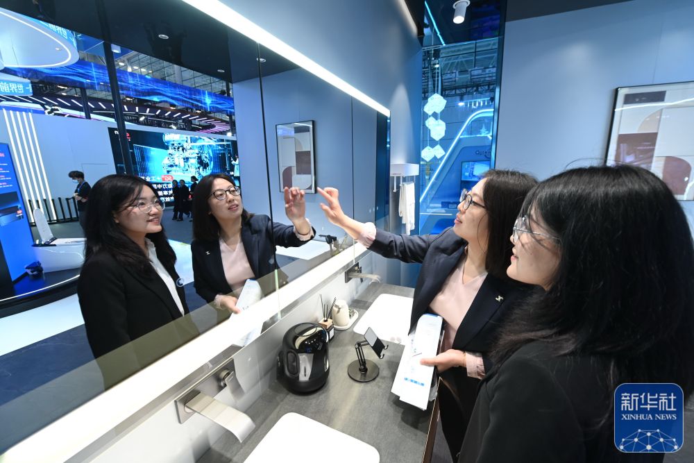 ↑4月26日,参观者在展览现场了解支持鸿蒙智联的九牧卫浴智能产品。