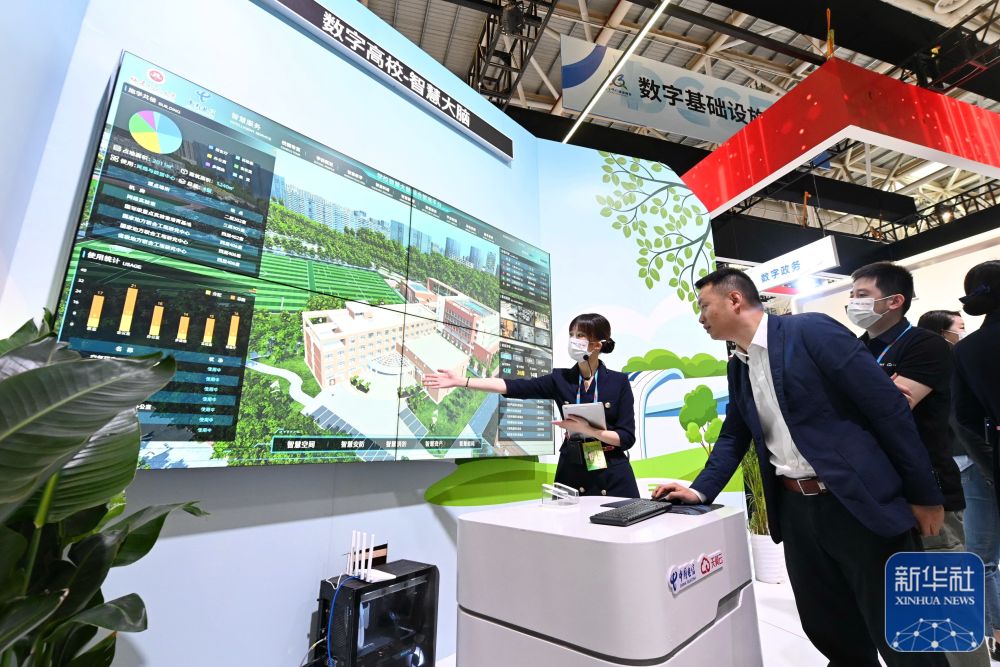 ↑4月26日,数字福建建设成果专区工作人员在展览现场向参观者介绍数字高校智慧大脑综合管理平台,该平台由福建师范大学和中国电信福州分公司联手打造。