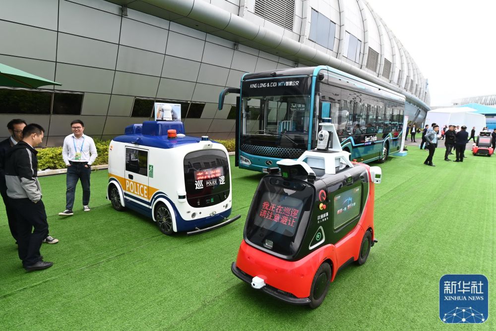 ↑4月26日在第六届数字中国建设成果展览会上拍摄的多种智慧车辆。