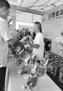 开幕式前,提前一两个小时安检入场的观众,远远就看到“翔翔”的召唤,纷纷在吉祥物专营区扎堆。“68元一个,就剩30个了。”专营区的售卖者告诉山西晚报记者,他们也没想到这只褐马鸡如此受欢迎,很快就要被抢没了。大同的赵女士抢到一个,她说朋友从外地刚回来不方便出门,让她买一个留作纪念。
