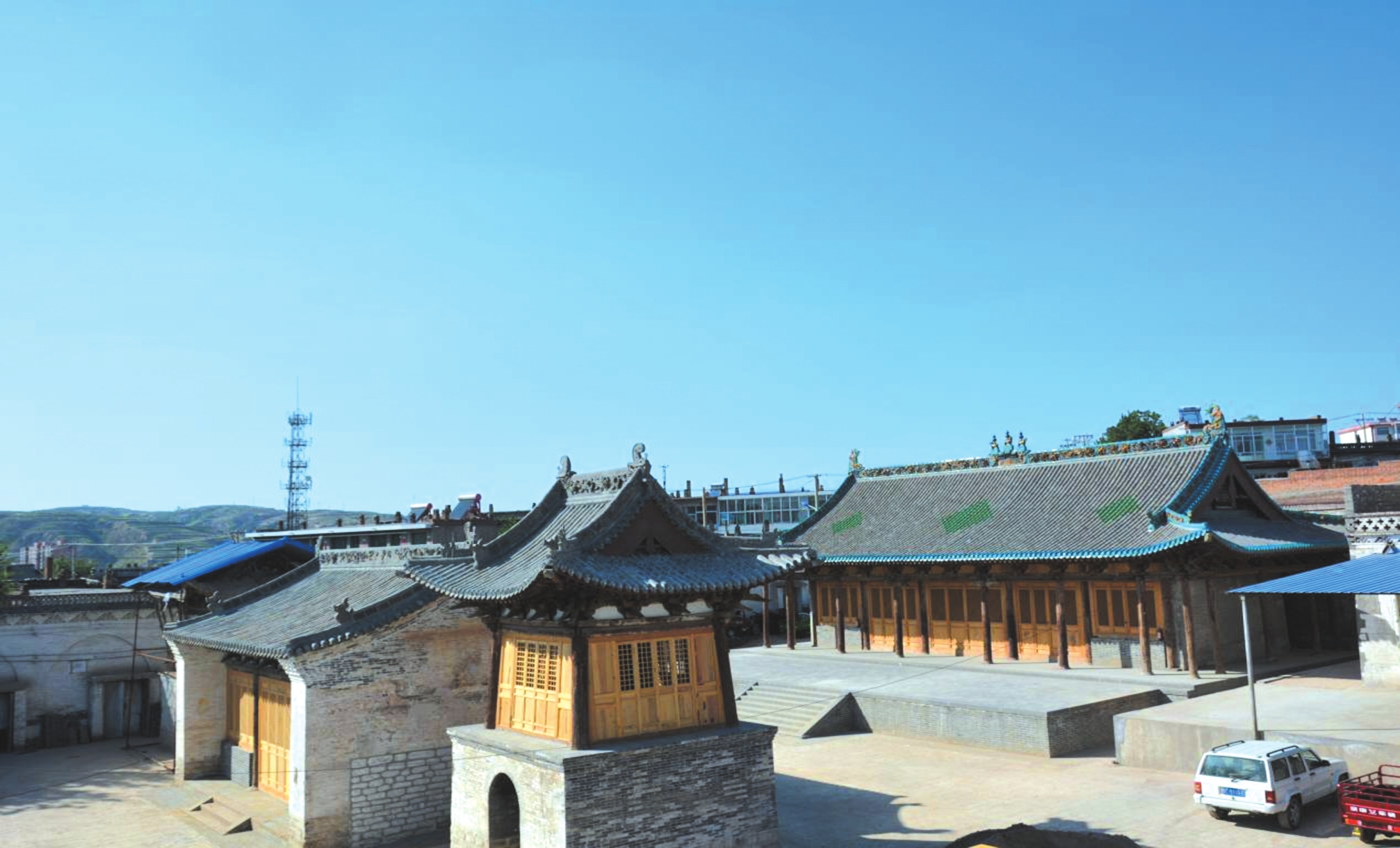 隆岗寺位于偏关县新关镇城内隆岗街,又称南寺庙。该庙坐北朝南,南北长38米、东西宽26米,占地面积988平方米,建筑面积454平方米。寺庙始建于唐代,明清时曾重修,中轴线现存天王殿、正殿,两侧为钟楼、鼓楼。正殿建于高1.2米的石砌台基上,面宽五间,进深六椽,四周围廊,单檐歇山顶,绿琉璃瓦剪边,七檩前后廊式构架,斗拱三踩单昂,平身科每间一攒,门窗已被后人改动。