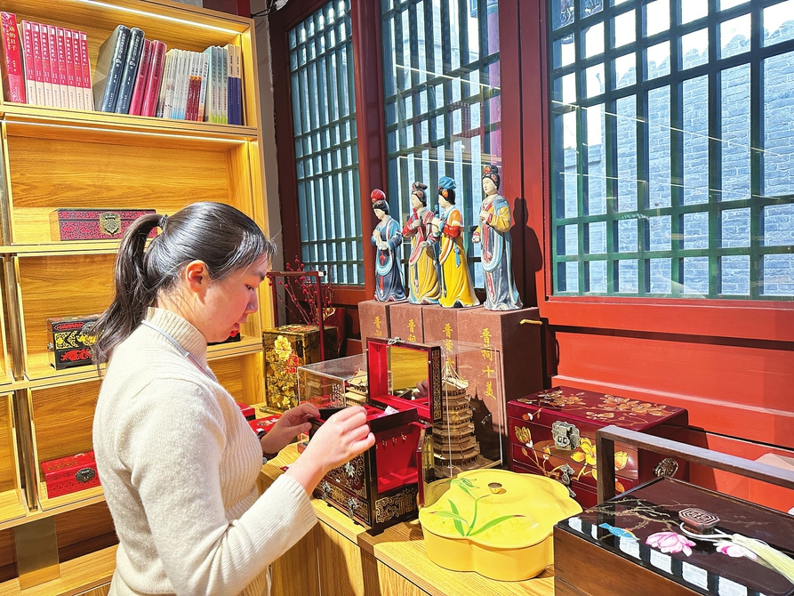 山西非遗文创馆工作人员倪博珺正在整理平遥推光漆器首饰盒。