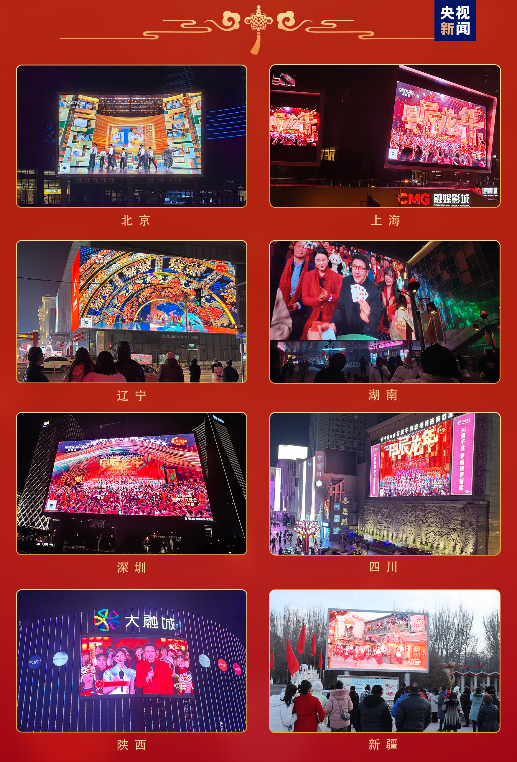 “百城千屏”看春晚。全国31个省、自治区、直辖市全覆盖,北京、上海、深圳、沈阳、长沙、西安等全国112个城市的1075块地标大屏配合云听客户端的三维菁彩声同步直播春晚,在核心商圈、城市广场、机场等交通枢纽,清晰震撼的视听效果吸引了城乡居民、归乡旅客驻足观看,为除夕的城市夜空增添了一抹喜庆贴心的温暖。