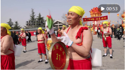 新春佳节,在山西省永济市鹳雀楼景区,民间艺人们表演社火“背冰”,受到游客的热烈欢迎。只见在凛冽的寒风中,二十多名黄河汉子冒着零度左右的气温,身着短裤赤膊上阵,背着从黄河里捞起的大冰块,在锣鼓伴奏下列队前行,展示了黄河汉子彪悍勇敢、不畏艰难困苦的铁骨精神,寄托了劳动人民祛邪、避灾、祈福的美好愿景。