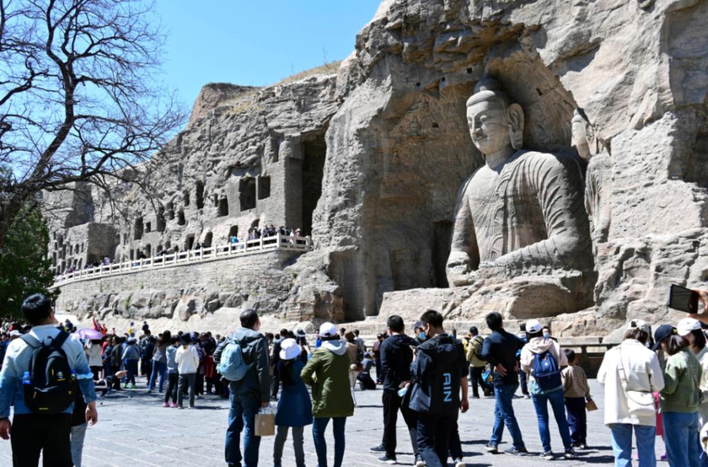 ▲2023年5月,游客在大同云冈石窟游览。云冈石窟的开凿始于北魏时期,为中国规模最大的古代石窟群之一,与敦煌莫高窟、洛阳龙门石窟和天水麦积山石窟并称为中国四大石窟艺术宝库。山西日报记者刘通摄