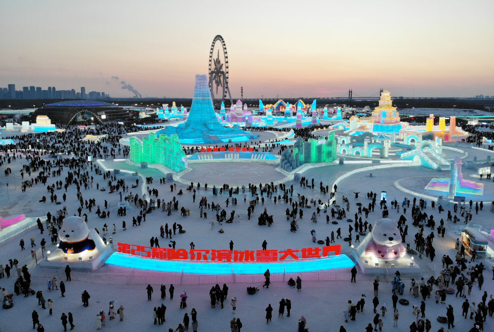 2024年2月15日,游客在哈尔滨冰雪大世界园区内游玩(无人机照片)。新华社记者 王建威 摄