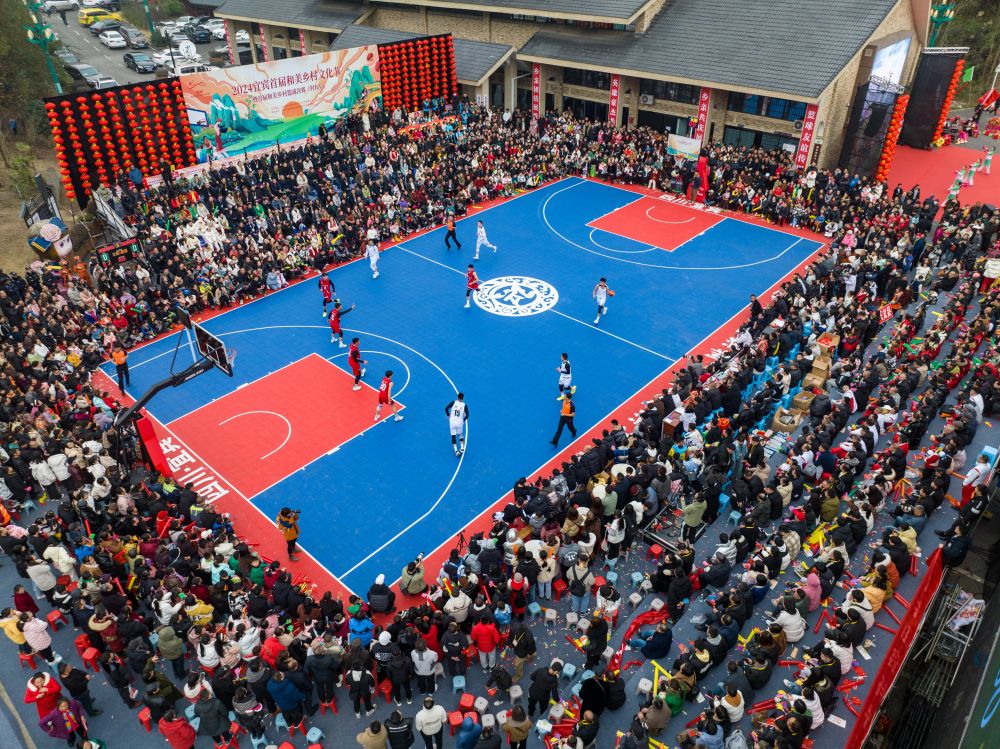 2024年1月29日,村民、游客在现场观赛(无人机照片)。当日,在四川省宜宾市珙县巡场镇三合村,2024宜宾首届和美乡村文化节暨首届和美乡村篮球决赛(村BA)举行,同时,现场还举行了非遗年货购物节、消费券发放等活动,以赛事经济激发乡村活力。新华社发(庄歌尔摄)
