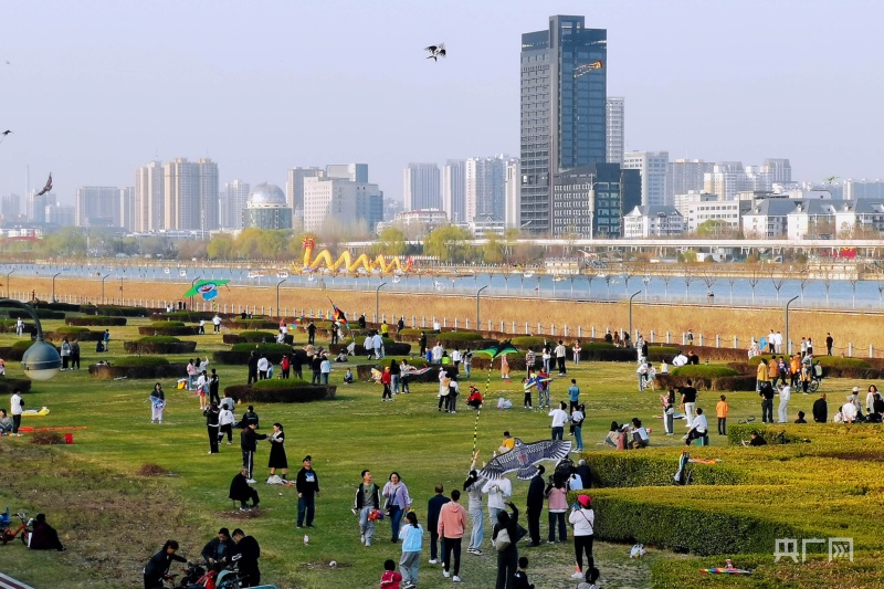 市民聚集在绿意盎然的汾河岸畔放风筝(央广网记者 郎麒 摄)