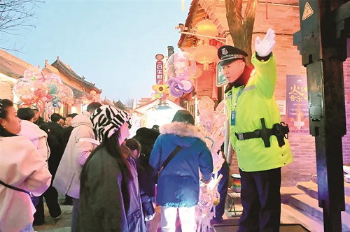 与热闹喜庆人群相伴而行的是执勤民警贴心服务的身影。