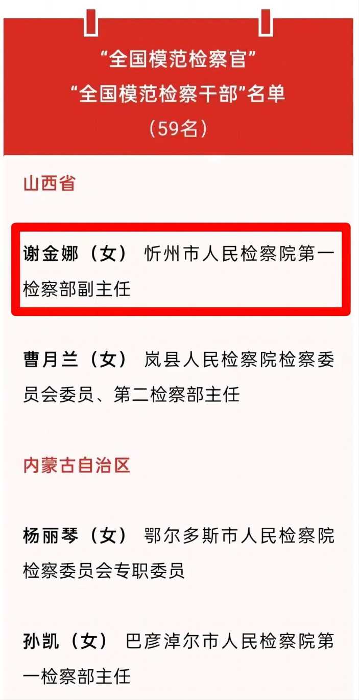 近日,人力资源社会保障部和最高人民检察院联合发布《关于表彰“全国模范检察院”“全国模范检察官(检察干部)”的决定》,忻州市人民检察院第一检察部副主任谢金娜被授予“全国模范检察官”称号。