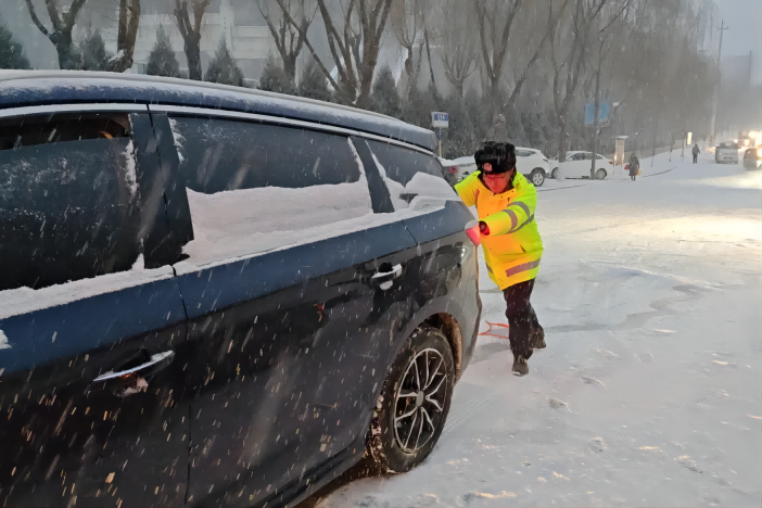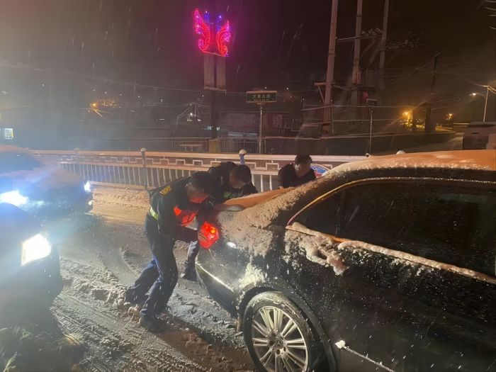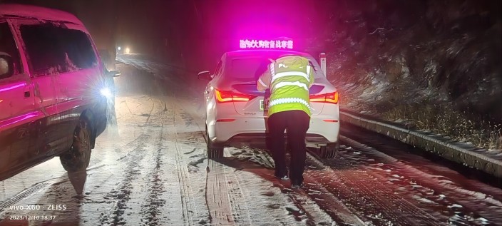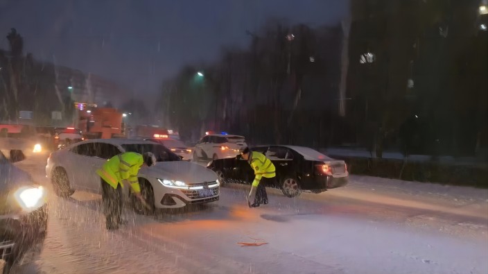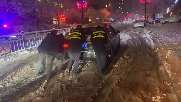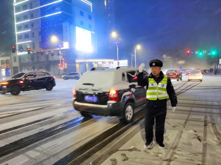 一个个忙碌的交警背影,一辆辆巡逻警车,一声声路上注意安全的提醒,成为寒冬中的“最美雪警”。