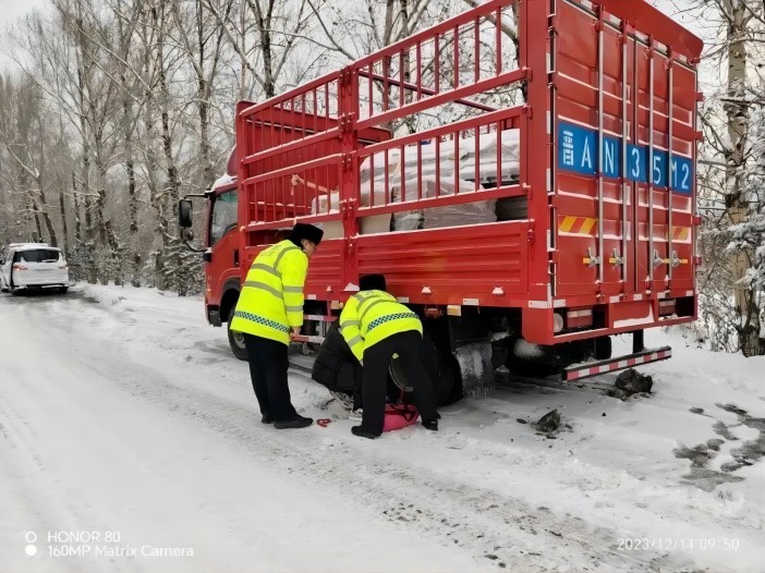 ▲五台交警帮助被控车辆推车,协助货车司机安装防滑链。