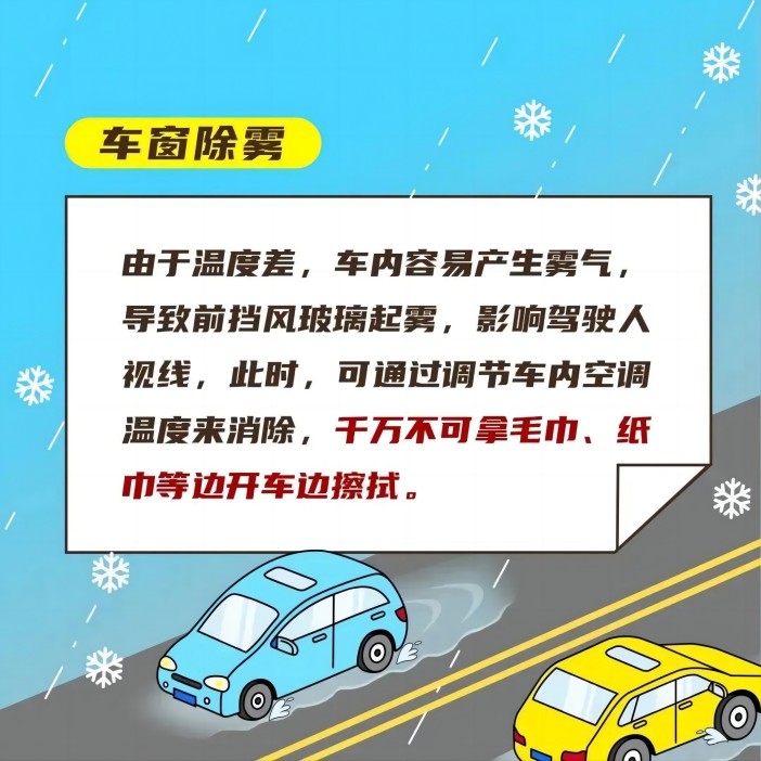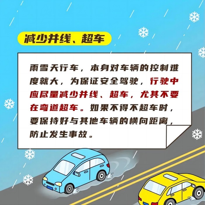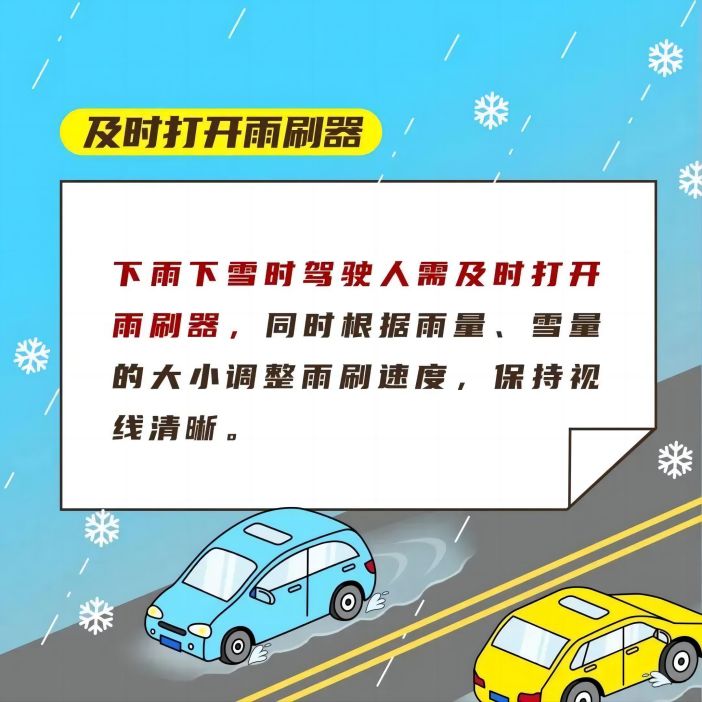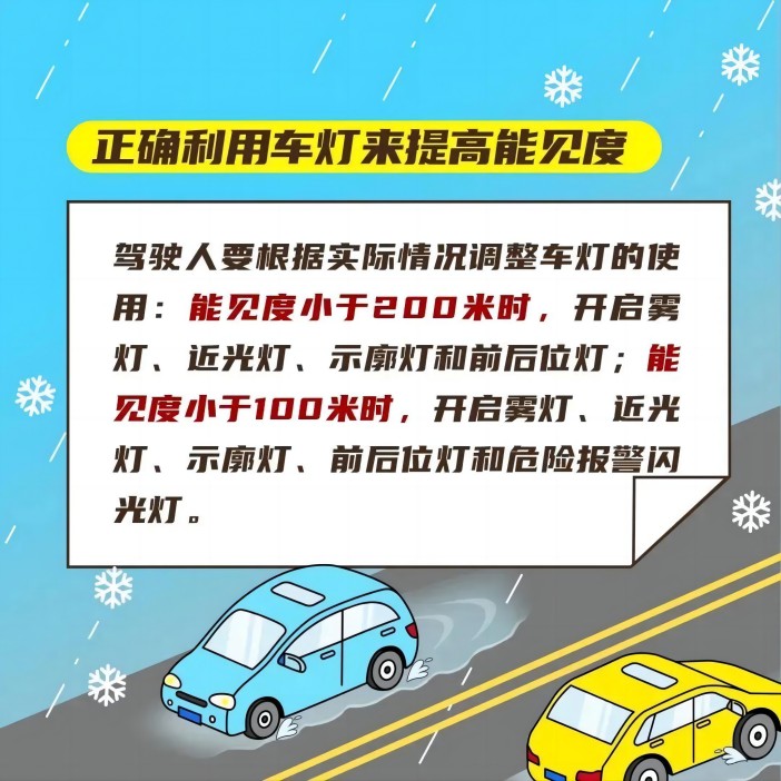 出行前一定要合理规划行车线路,遇雨雪天气行车要牢记“降速、控距、亮尾”,打开雾灯、示廓灯、危险报警闪光灯,保持与横向、纵向车辆的安全距离。要尽量避免变道行驶、强超强会、急刹急转,以防发生危险。