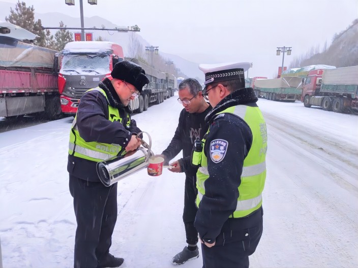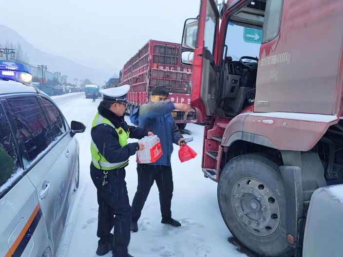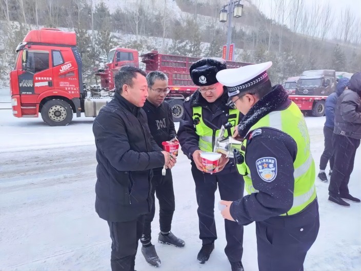 ▲岢岚交警为滞留车辆司机送上热水泡面等补给用品