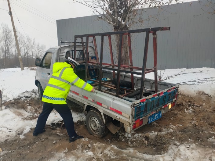 ▲偏关交警为通行货车轮胎撒土防滑