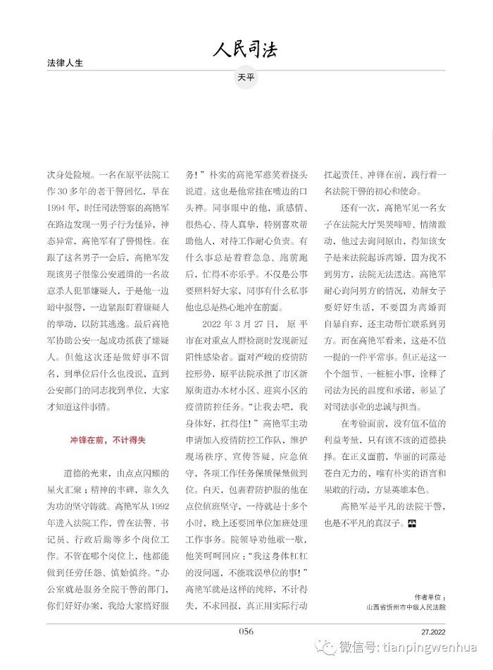 还有一次,高艳军见一名女子在法院大厅哭哭啼啼、情绪激动,他过去询问原由,得知该女子是来法院起诉离婚,因为找不到男方,法院无法送达。高艳军耐心询问男方的情况,劝解女子要好好生活,不要因为离婚而自暴自弃,还主动帮忙联系到男方。而在高艳军看来,这是不值一提的一件平常事。但正是这一个个细节、一桩桩小事,诠释了司法为民的温度和承诺,彰显了对司法事业的忠诚与担当。