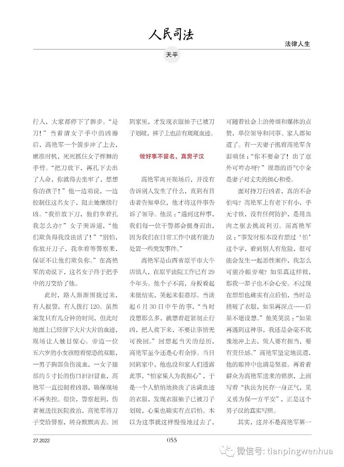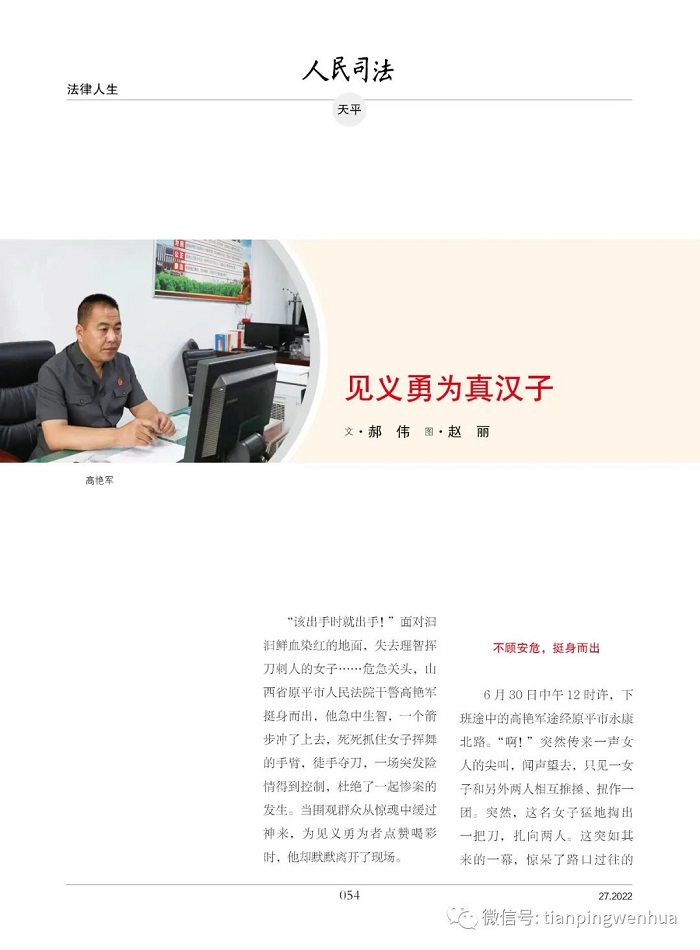 “该出手时就出手!”面对汩汩鲜血染红的地面,失去理智挥刀刺人的女子……危急关头,山西省原平市人民法院干警高艳军挺身而出,他急中生智,一个箭步冲了上去,死死抓住女子挥舞的手臂,徒手夺刀,一场突发险情得到控制,杜绝了一起惨案的发生。当围观群众从惊魂中缓过神来,为见义勇为者点赞喝彩时,他却默默离开了现场。