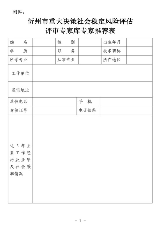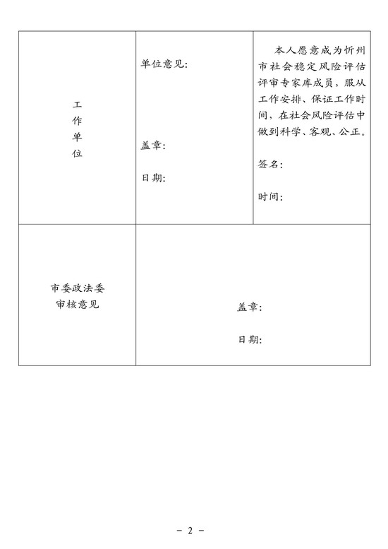 (二)自公告之日起,可在政府门户网上自行下载《忻州市社会稳定风险评估专家库专家推荐表》,按照规定填写,加注所在单位(原单位)意见 ,加盖公章后报回市委政法委。
