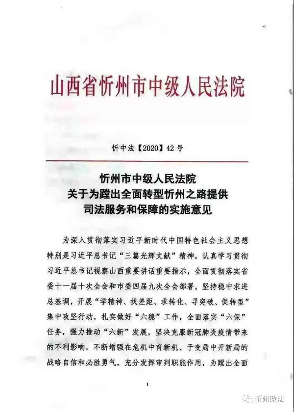 2020年,忻州市对全市转型升级作出全面部署,动员全市各级党员干部凝心聚力、苦干实干,奋力蹚出全面转型的忻州之路。忻州中院坚持围绕中心、服务大局,紧密结合全市法院工作实际,迅速出台了《忻州市中级人民法院关于为蹚出全面转型忻州之路提供司法服务和保障的实施意见》(以下简称《意见》)。该《意见》的出台,是为了深入学习贯彻习近平总书记“三篇光辉文献”和视察山西重要讲话重要指示,认真落实落细省委十一届十次全会精神和市委四届九次全会部署,围绕中心、服务大局,更加充分发挥审判执行职能作用。《意见》内容涵盖了刑事、民事、商事、行政等各个审判领域,细化到了立案、调解、审判、执行等各个具体环节,从3个方面作出39条具体规定,充分发挥司法防控风险、化解矛盾、维护稳定、保障发展、优化环境等作用,为蹚出全面转型忻州之路提供司法服务和保障。