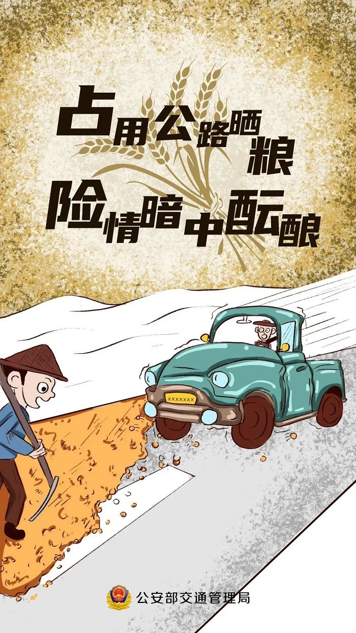 在公路上打场晒粮不仅影响了过往车辆正常通行,还给道路交通和自身安全带来了极大的安全隐患。
