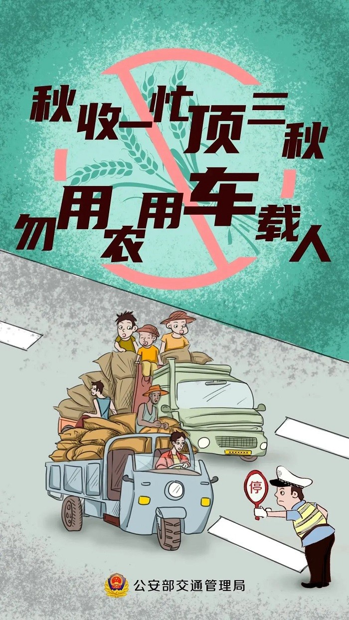 眼下家家户户秋收农忙,但是地里农活儿再忙,交通安全始终不能忘。忻州交警提醒广大村民:为了您的家庭幸福,请时刻牢记交通法规,不驾驶无牌无证、报废和拼装的农用车辆上道路行驶,不酒后驾驶,不违法载人,骑乘二三轮电动车、摩托车要佩戴安全头盔,农村道路上靠右行驶,不占用对向车道,不横穿猛拐。