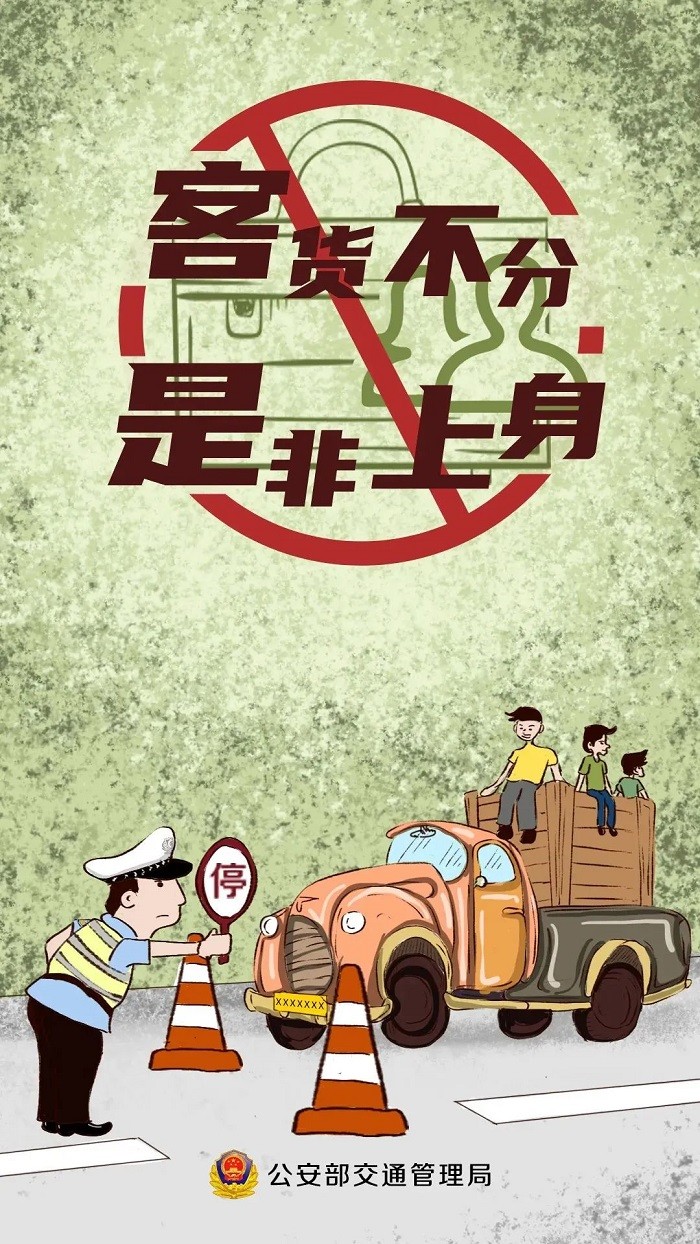 当您出行时,请勿搭乘非法营运车和超员车,以及货运车、农用车、拖拉机等非载人车辆,尤其是农用三轮车,行驶速度快,发生事故概率高,且大多无牌无证无保险,无法有效保障您的出行权益。村民们一定要到车站乘坐正规的村村通班线客车。