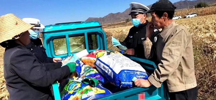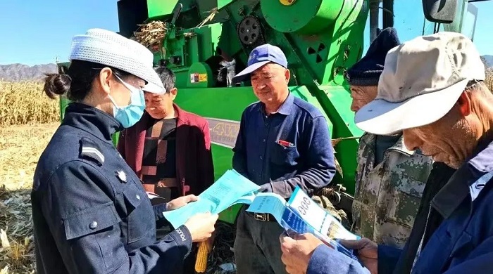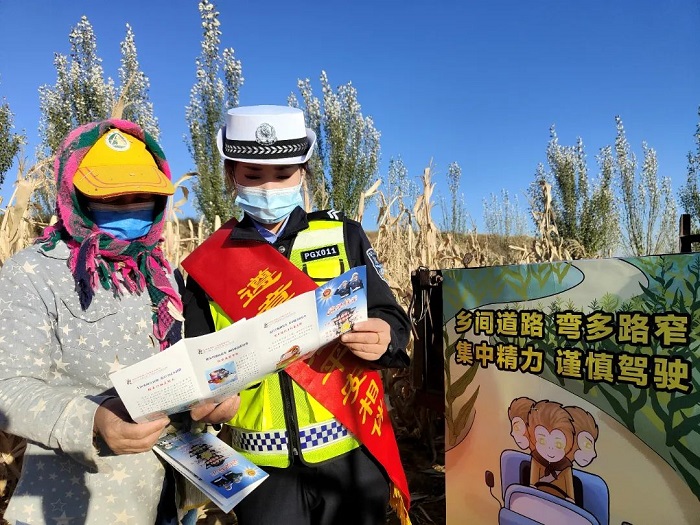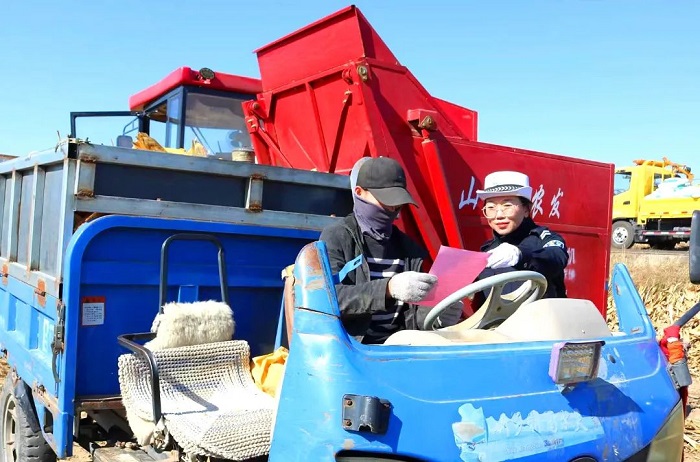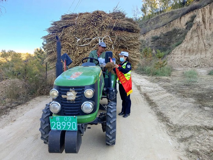 ▲河曲公安交警深入田间地头利用休息间隙发放宣传海报、手提袋等宣传品发至农用车驾驶人手里,嘱咐他们驾驶农机在公路上行驶或运送农用物资时提高交通安全意识,既要搞好田间作业,又要遵守交通法规。