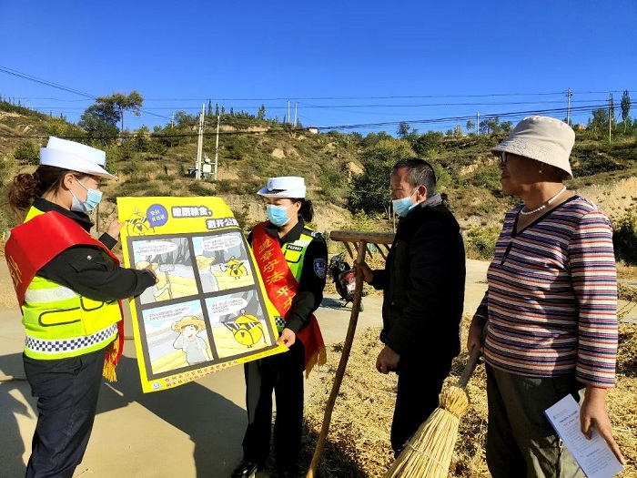 ▲当前正值打谷晒粮时节,偏关公安交警通过面对面讲解、发放宣传资料、张贴海报等形式,提醒广大农民群众,切勿将公路当成“晒谷场”,严禁三轮车违法载人,劝导大家一定要摒弃交通陋习,养成安全文明出行的良好习惯。