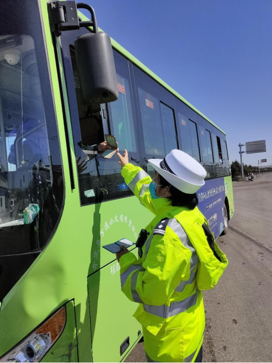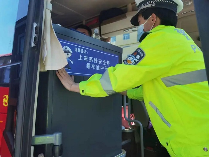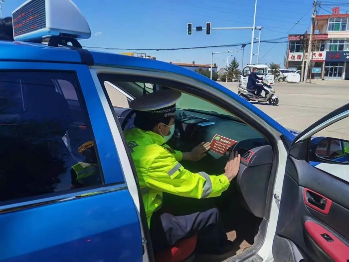 5月2日,五寨交警为辖区的公交车、客运车、出租车等重点车辆粘贴“请系好安全带”交通安全标语车贴,为每一辆车“烙”上安全文明之印。