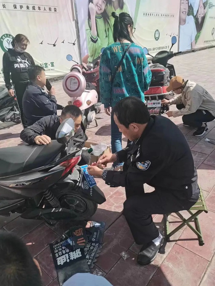 五一期间,河曲交警联合人寿保险公司在广场举行电动车上牌便民活动。