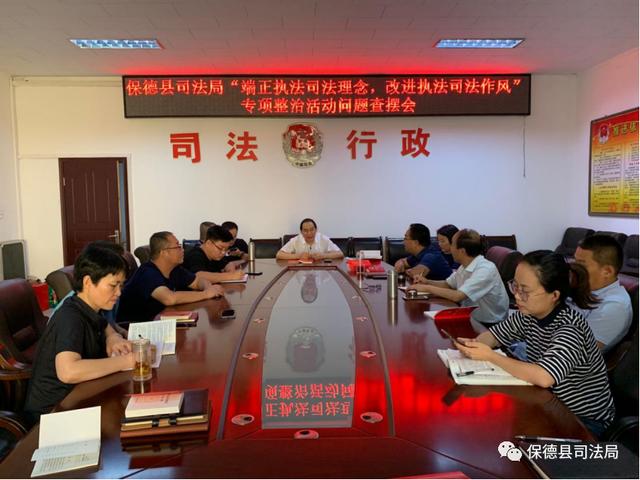8月19日下午,保德县司法局进行“端正执法司法理念、改进执法司法作风”专项整治活动问题查摆会。重点围绕“六大理念”,纠治“四个方面”不良作风,做好“十个方面”的工作来开展。
