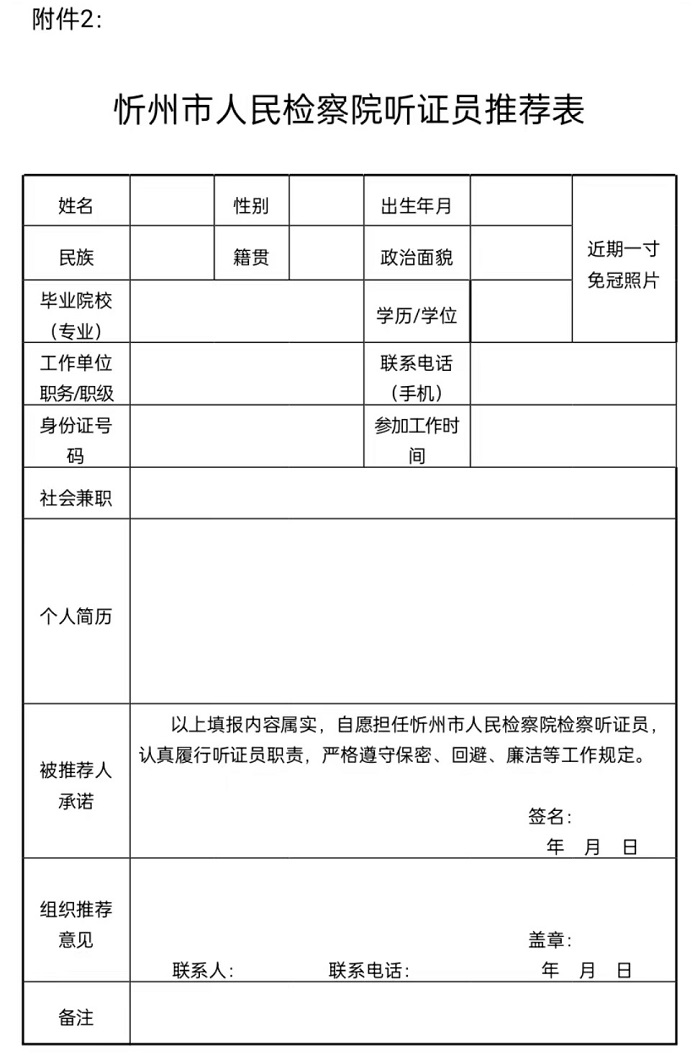 接受组织推荐报名和符合条件的个人自荐报名。报名时需填报《忻州市人民检察院听证员报名登记表(推荐表)》(须填写所在单位、推荐单位意见,并加盖单位公章),提交身份证、学历证书、学位证书复印件,以及近期免冠彩色一寸照片1张。