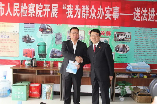 在原平市新聚星锅炉公司,周东曙检察长一行对生产车间实地考察后,召开了座谈会。会上,省人大代表、民营企业家任二平对忻州检察机关向民营企业提供的法律咨询、法律服务、法律帮助表示感谢,并就公司的运营状况、目标规划、企业精神作了详细介绍,开诚布公地与大家交流了企业在转型发展中所遇到的困难。在认真倾听民营企业家的发言后,周东曙检察长对企业家提出的问题耐心解答,讲解相关法律知识,既增强了员工的法律意识,又提高了公司防范风险的能力,达到了送法进企业的预期效果。座谈会后,市检察院为企业发放法律书籍5套、宣传手册80册、宣传活页300页。