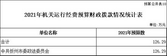2021年度忻州市委政法委机关运行经费财政拨款预算为126.29万元,比2020年的77.41万元增加48.88万元。机关运行经费主要包括一般公用经费、公务用车运行维护费、培训费、工会经费、福利费、会议费、其他交通费用。