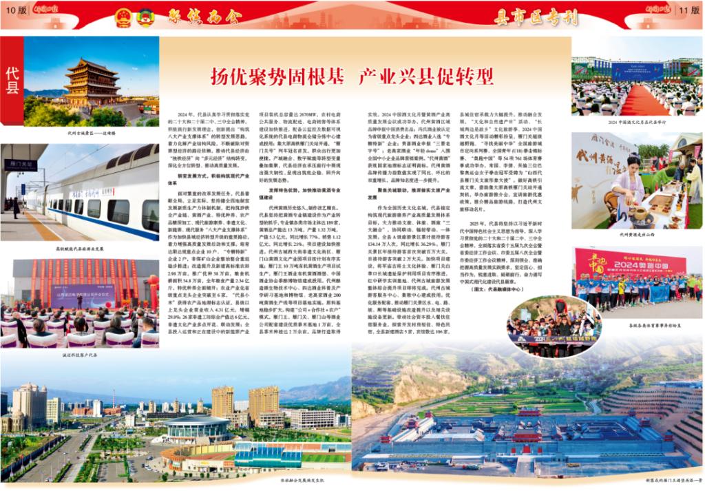 转变发展方式,积极构筑现代产业体系面对繁重的改革发展任务,代县着眼全局,立足实际,坚持健全因地制宜发展新质生产力体制机制,把构筑涉铁全产业链、黄酒产业、特优种养、农产品精深加工、现代旅游康养、非遗文化、新能源、现代服务“八大产业支撑体系”作为加快县域经济转型升级的重要路径,着力增强高质量发展后劲和支撑。培育达限达规重点企业10户、“专精特新”企业2户,非煤矿山企业整治整合重组稳步推进;改造提升及新建高标准农田2.98万亩,推广优种38万亩,粮食机耕面积34.8万亩,全年粮食产量2.34亿斤,特优种养全面铺开;农业产业化省级重点龙头企业突破至6家,“代县小米”获得农产品地理标志认证,县级以上龙头企业营业收入4.31亿元,增幅29.8%;26家非遗工坊综合产值达6亿元,非遗文化产业多点开花、联动发展;全县投入运营和正在建设中的新能源产业项目装机总容量达2670MW,农村电商公共服务、物流配送、电商销售等体系建设加快推进,配备云监控及数据可视化系统的代县电商物流仓储分拣中心建成投用;集大原高铁雁门关站开通,“雁门关号”列车冠名首发,群众出行更加便捷。产城融合、数字赋能等转型变量叠加集聚,代县经济在承压前行中展现出强大韧性,呈现出筑底企稳、回升向好的发展态势。