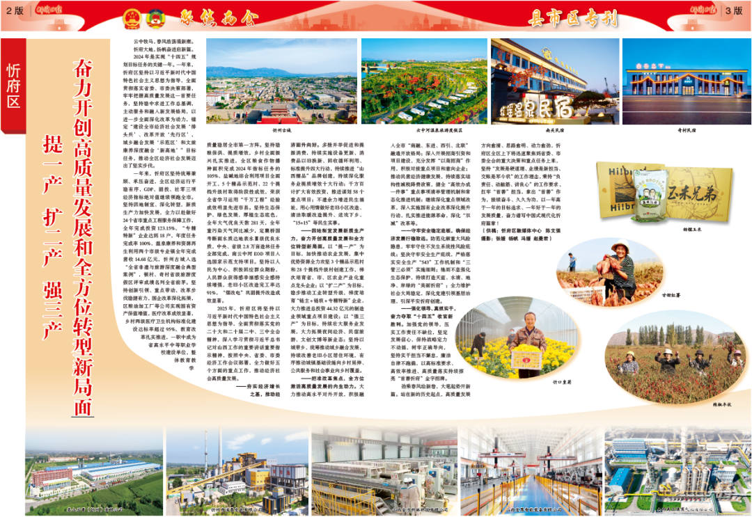 一年来,忻府区坚持统筹兼顾、承压奋进,全区经济运行平稳有序,GDP、固投、社零三项经济指标绝对值继续领跑全市。坚持因地制宜、深化转型,新质生产力加快发展,全力以赴做好24个省市重点工程服务保障工作,全年完成投资123.15%,“专精特新”企业达到18户,年度任务完成率100%,温泉康养和资源再生利用两个市级专业镇全年完成营收14.68亿元,忻州古城入选“全省非遗与旅游深度融合典型案例”,顿村、奇村省级旅游度假区评审成绩名列全省前茅。坚持创新引领、重点带动,改革步伐稳健有力,国企改革深化拓展,区粮油加工厂等公司实现国有资产保值增值,医疗改革成效显著,乡村两级医疗卫生机构标准化建设达标率超过95%,教育改革扎实推进,一职中成为省高水平中等职业学校建设单位,整体教育教学质量稳居全市第一方阵。坚持稳粮保供、提质增效,乡村全面振兴扎实推进,全区粮食作物播种面积完成2024年指标任务的105%,盐碱地综合利用项目全面开工,5个精品示范村、22个提档升级村取得阶段性成效,荣获全省学习运用“千万工程”经验成效明显先进市县。坚持生态保护、绿色发展,厚植生态底色,全年大气优良天数281天,全年重污染天气同比减少,定襄桥国考断面水质达地表水Ⅲ级优良水质,中央、省级2.8万亩造林任务全部完成,南云中河EOD项目入选国家示范支持项目。坚持以人民为中心、积极回应群众期盼,人民群众获得感幸福感安全感持续增强,老旧小区改造完工率达91%,“煤改电”巩固提升改造成效显著。