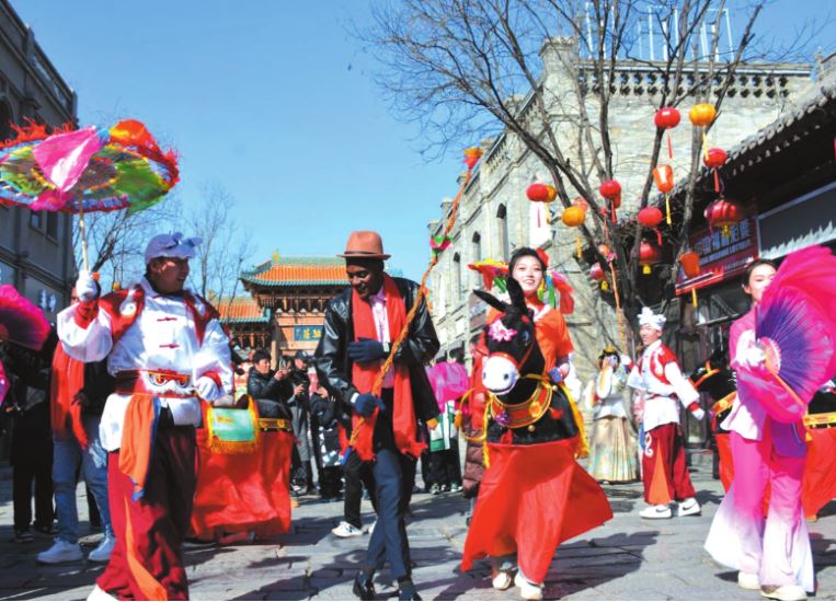 外国友人参与“跑驴”特色民俗表演活动。